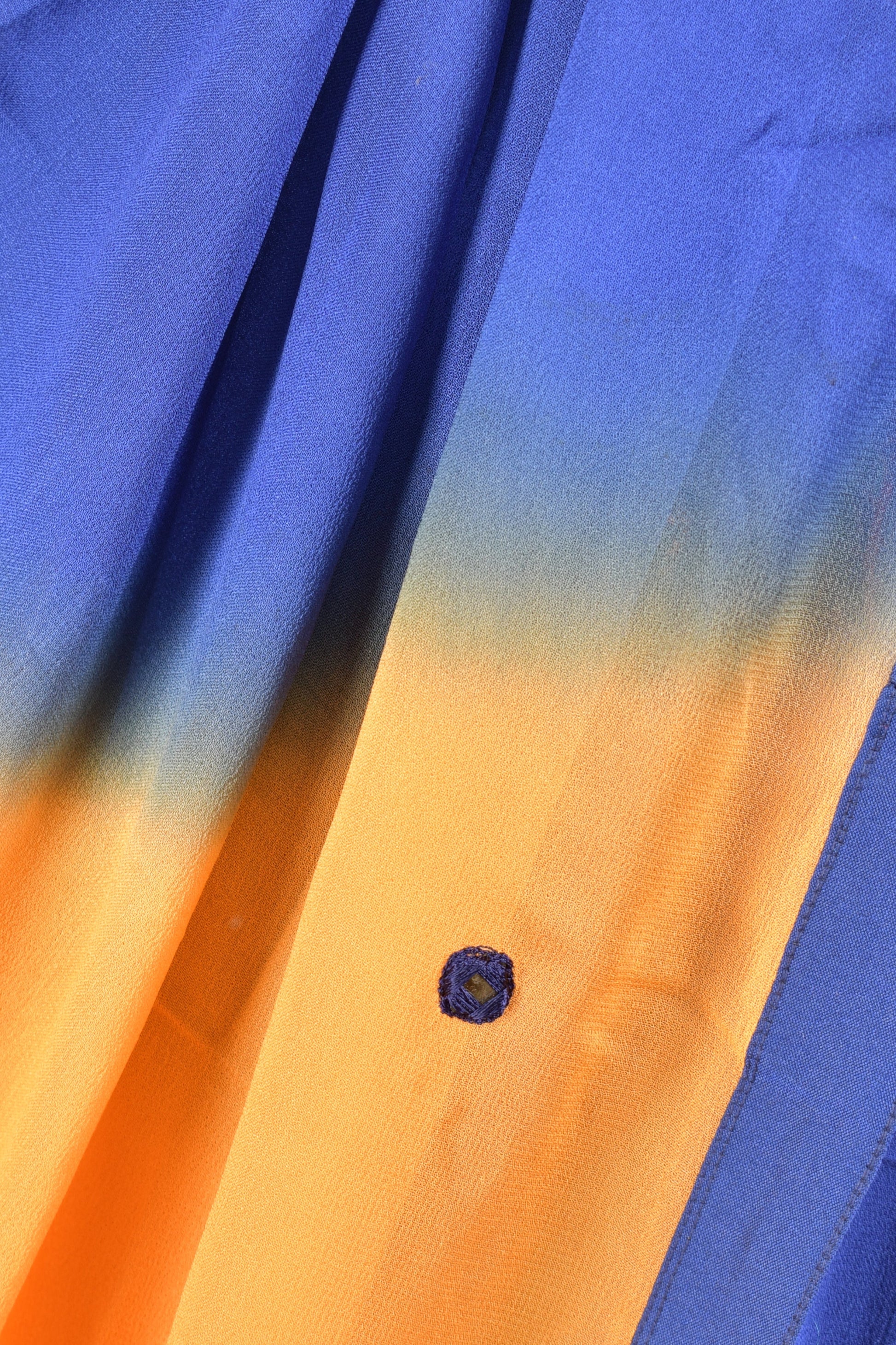Bright, festive, and made for movement — the Aanya Garba Lehenga Choli brings the spirit of Navratri to life. The blue and orange printed silk blend lehenga bursts with energy, perfectly balanced by a white mirror-embroidered silk blouse that reflects the light with every twirl. Finished with a georgette shaded dupatta adorned in mirror work, this set is a radiant pick for Garba nights and cultural celebrations.