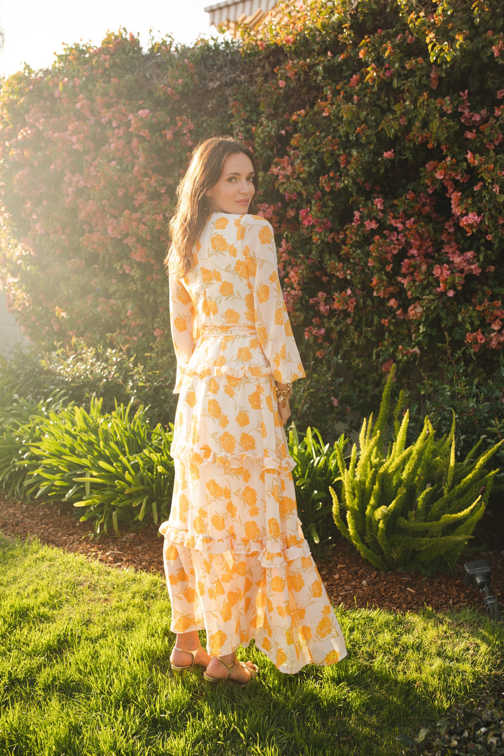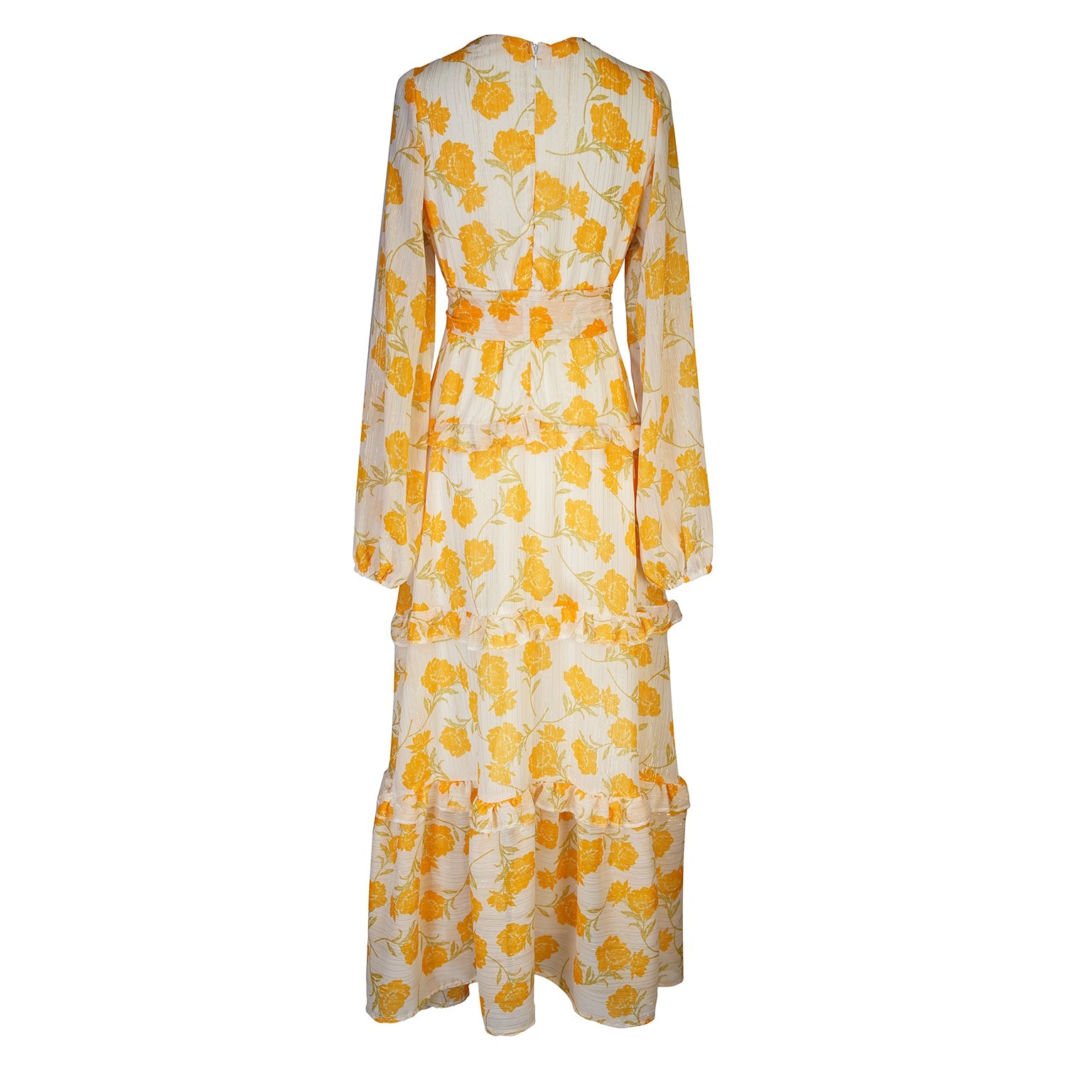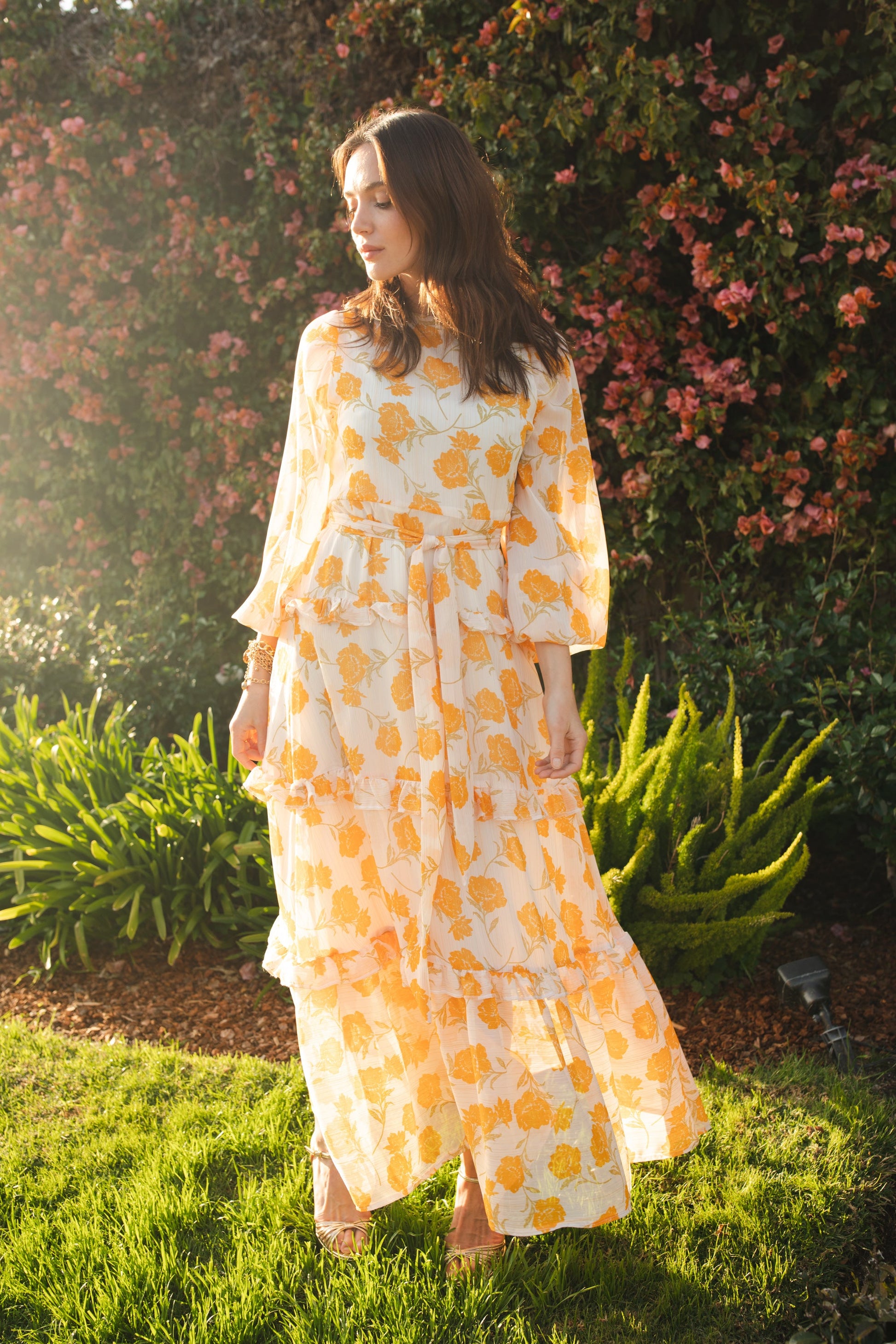Turn heads in this beautiful yet understated floral maxi. Crafted with a soft, metallic infused fabric, it features high neck, bishop sleeves, tiered ruffle skirt and matching sash for a cinched waist. It's light, airy silhouette is a nod to the romantic and whimsical, and is an easy choice for special occasions or an everyday look.