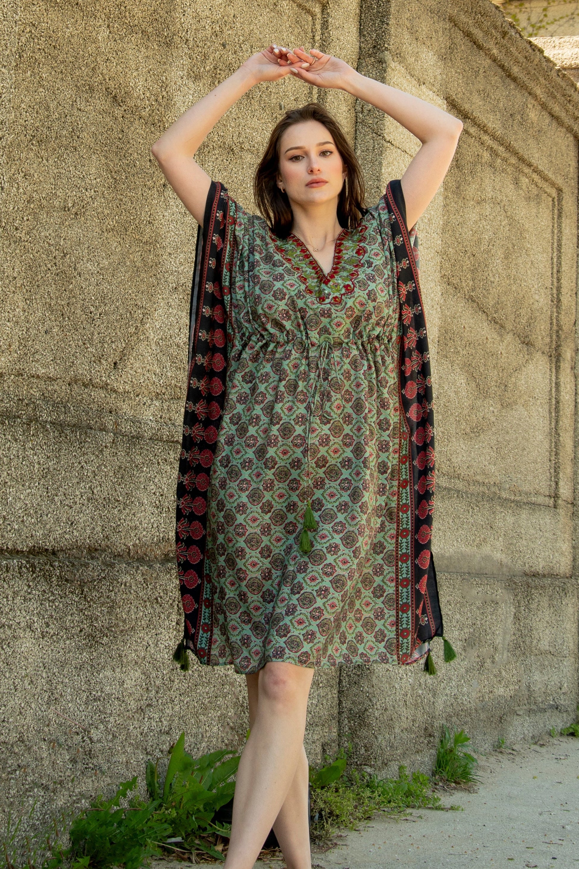 In a earthy green hue, the Avena Kaftan brings together timeless craft and breezy comfort. The kaftan is crafted from muslin silk and features an all-over Ajrakh print. The flowy silhouette drapes effortlessly, while the v-neckline is embroidered with delicate floral motifs. Perfect for warm summer days or relaxed evenings, this flowy kaftan is calming and captivating.