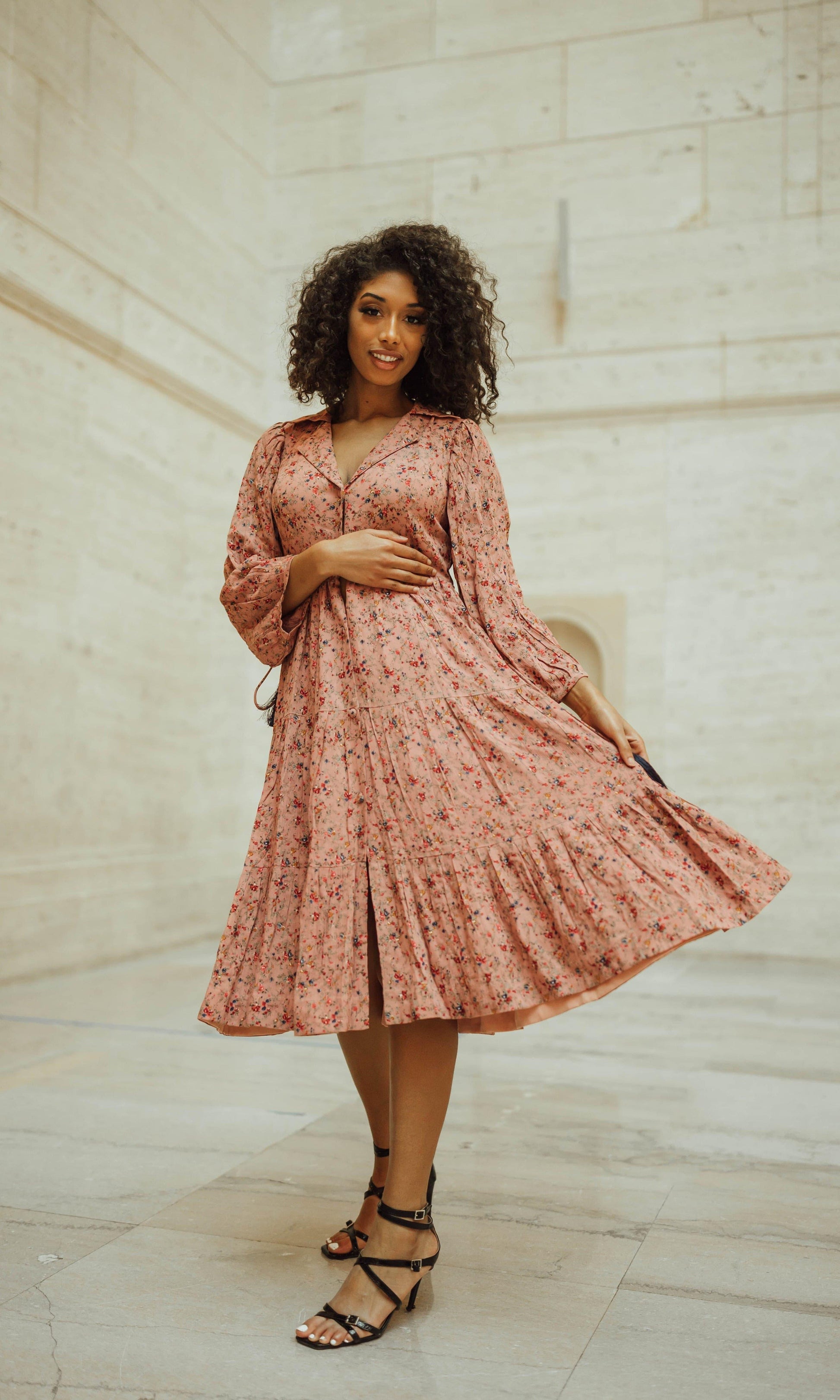 - Specifications: Fully lined, tiered, long sleeves, midi silhouette, floral print
