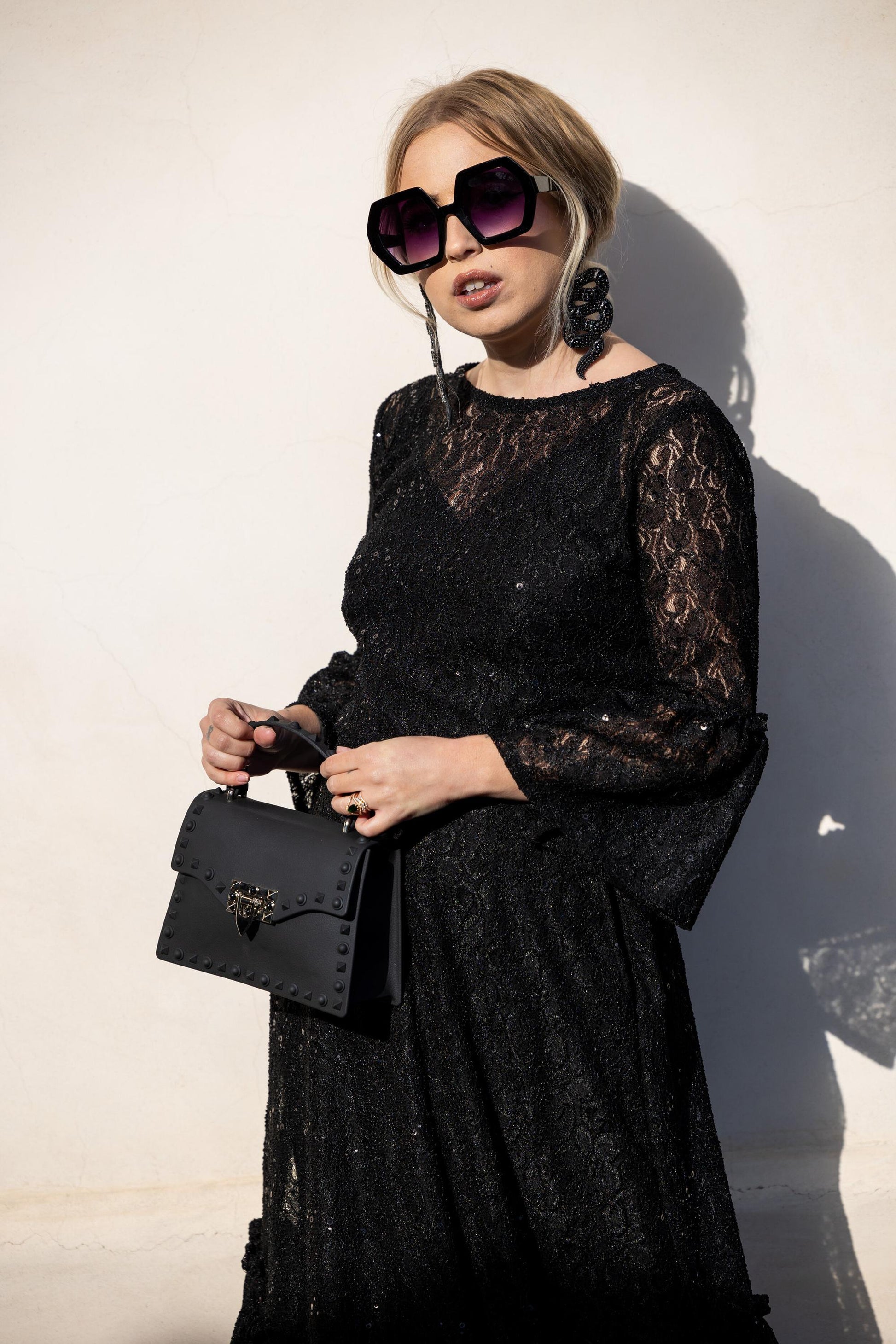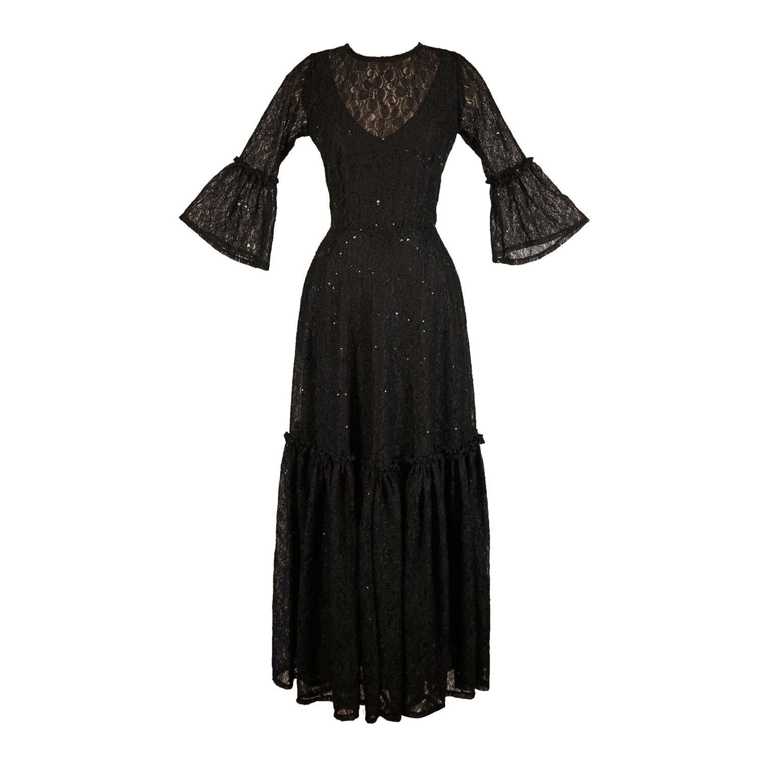 This luscious ruffled maxi dress features a hook & eye neck closure, pockets and a black jersey slip. Made from a gorgeous, lightweight black sequined lace and lots of love!