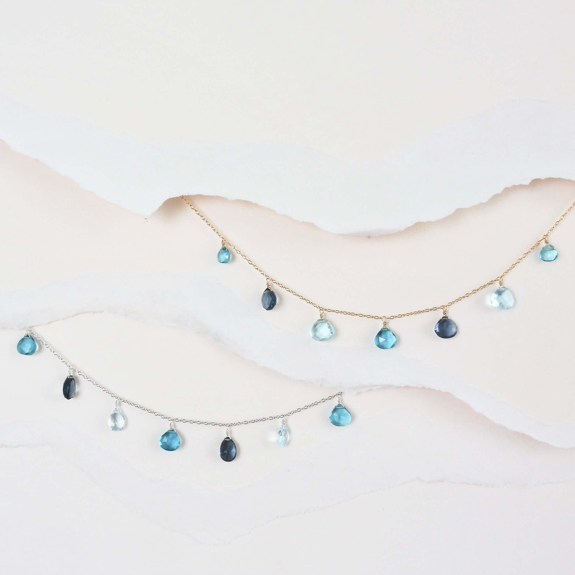 A lovely string of sparkling gems. Featuring Aquamarine, Iolite, and Aquamarine Blue Quartz gemstones, this 16-18" necklace comes with a 2" extender and a spring ring clasp. Made in our NYC studio with fine Italian sterling silver plated in rhodium, this gorgeous strand of gems shines like white gold and stays tarnish-free. Plus, each gemstone's unique nature makes this necklace truly one-of-a-kind. Packaged in a gift box and handmade to last.