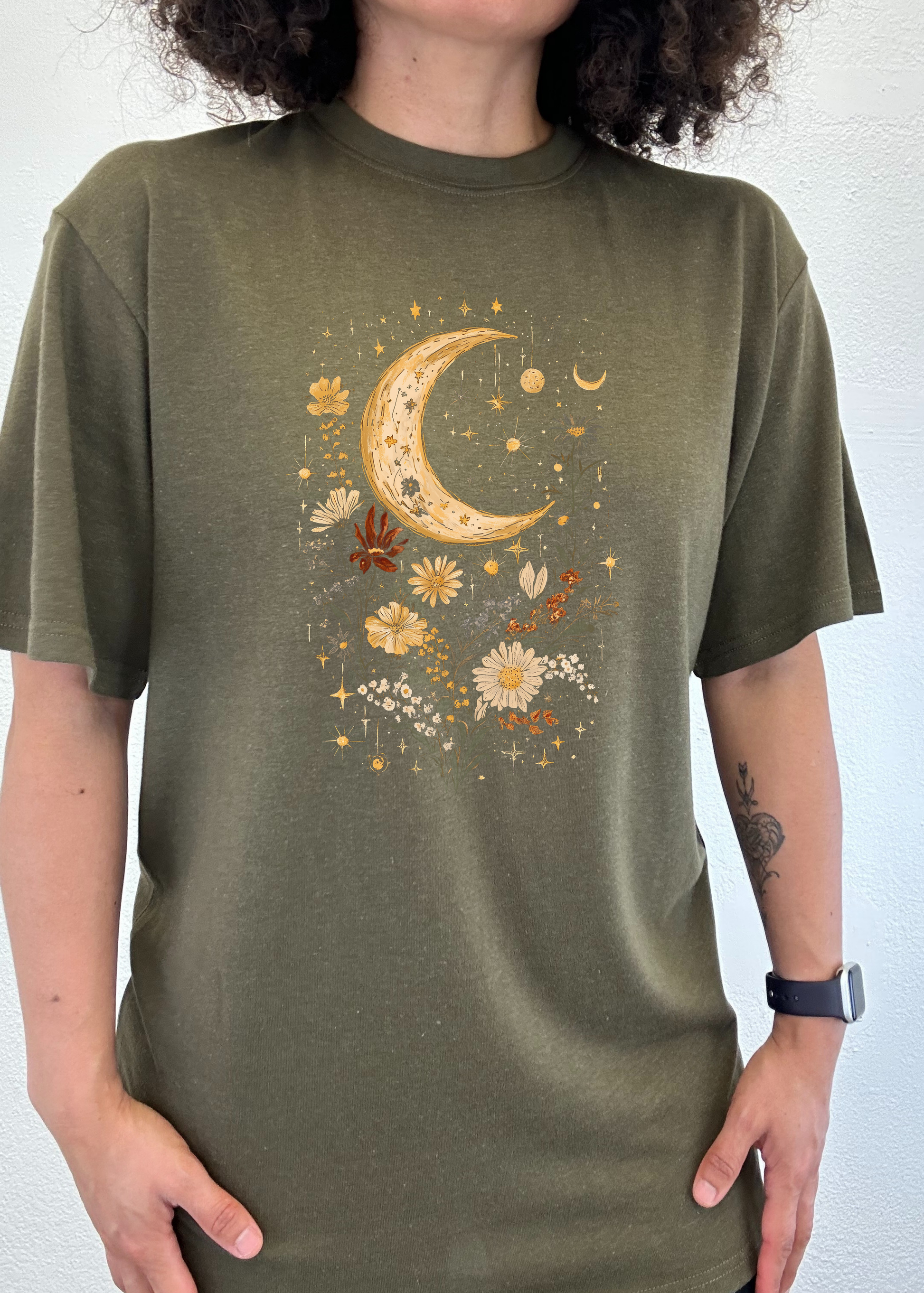 Celestial Moon Boho Flowers Vintage Unisex Bamboo/Cotton Graphic T-Shirt