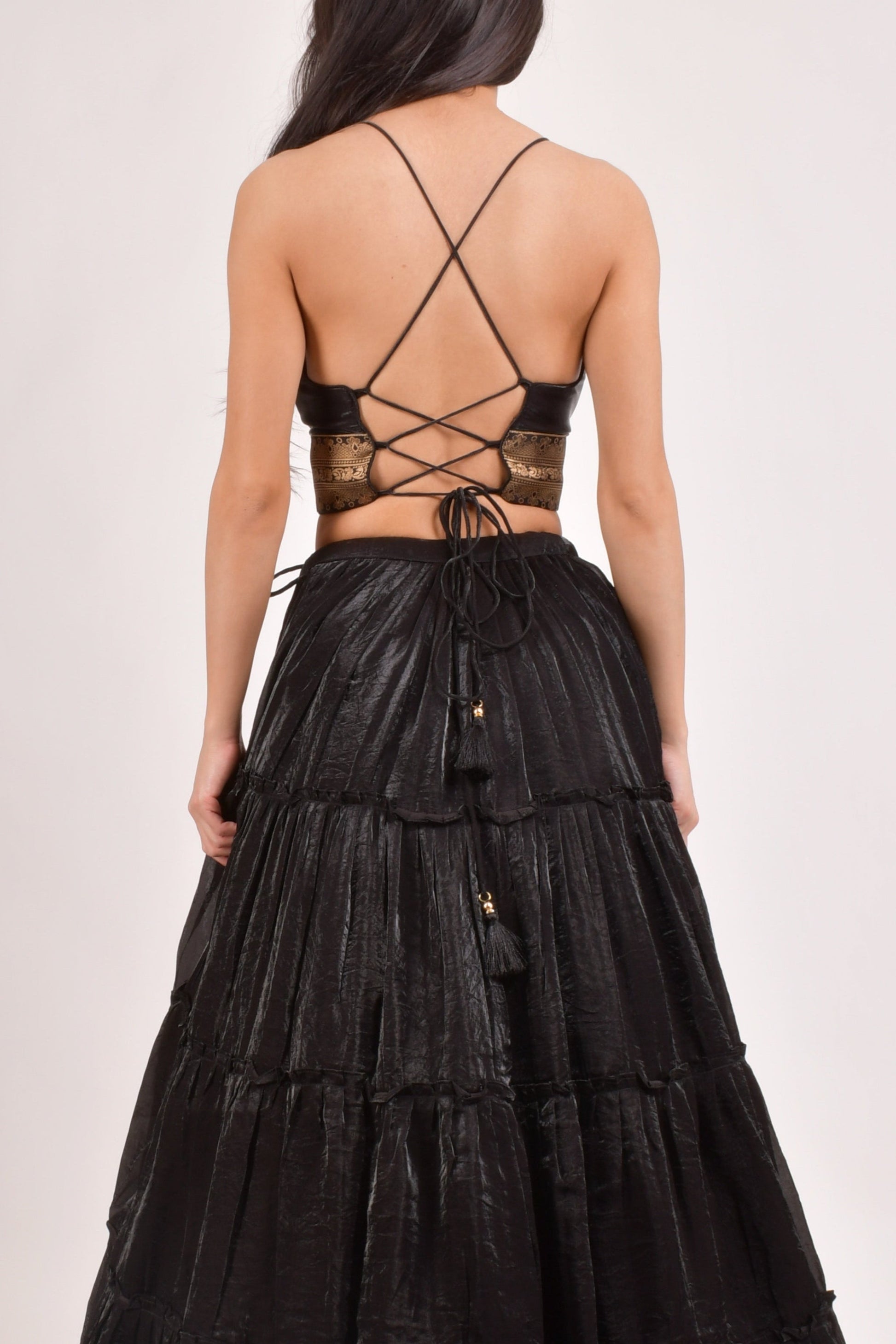 The Ciara Black Tiered Lehenga Choli Set showcases a rich combination of classic black and gold, featuring a deep v-neck silk blouse with a golden jacquard border and a tiered shimmer lehenga with a matching golden jacquard border. The black lehenga choli set is completed by a shimmer silk dupatta, which also features a jacquard border.