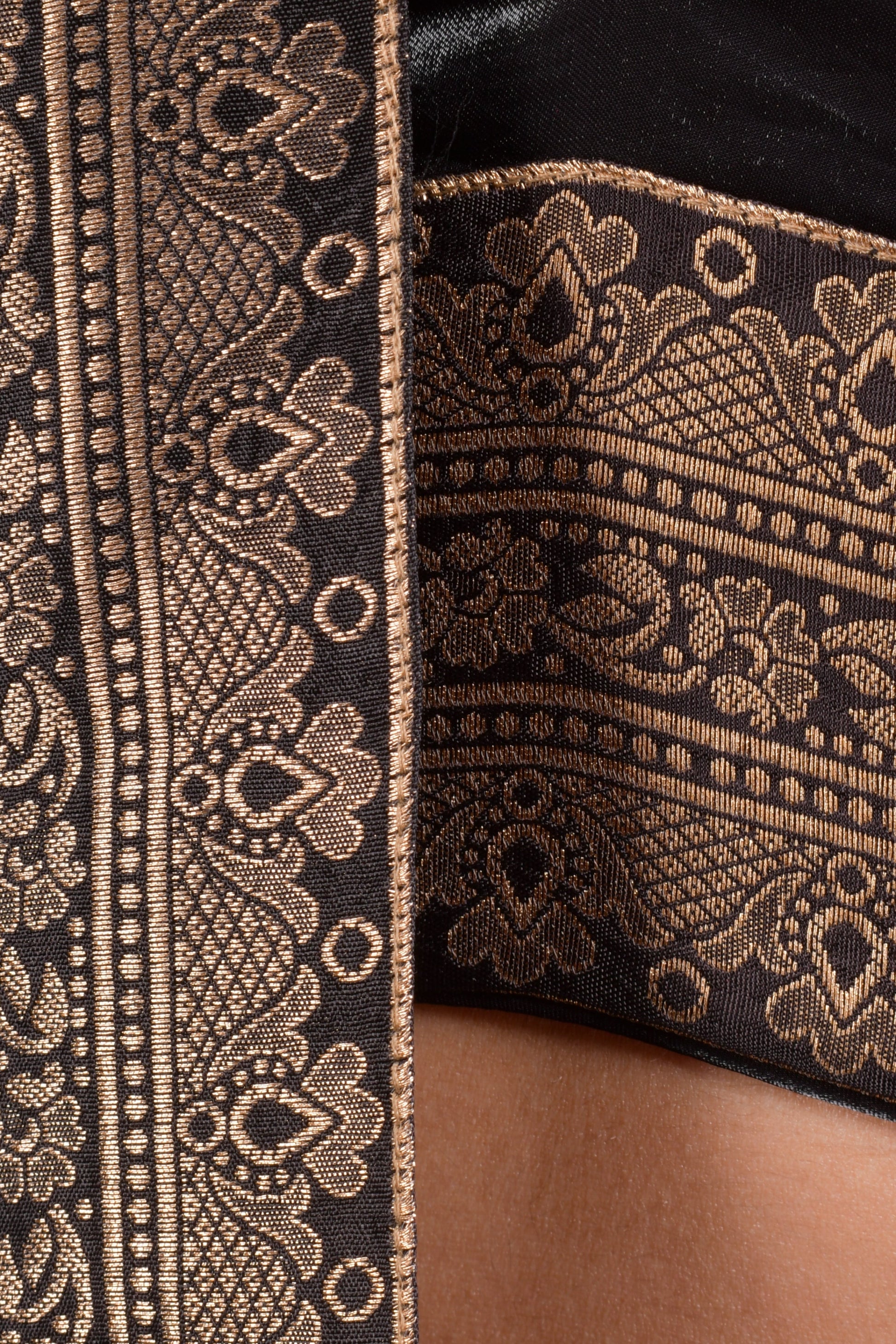 - Blouse: Sleeveless, deep v-neck, open back with string ties, fully lined, jacquard border