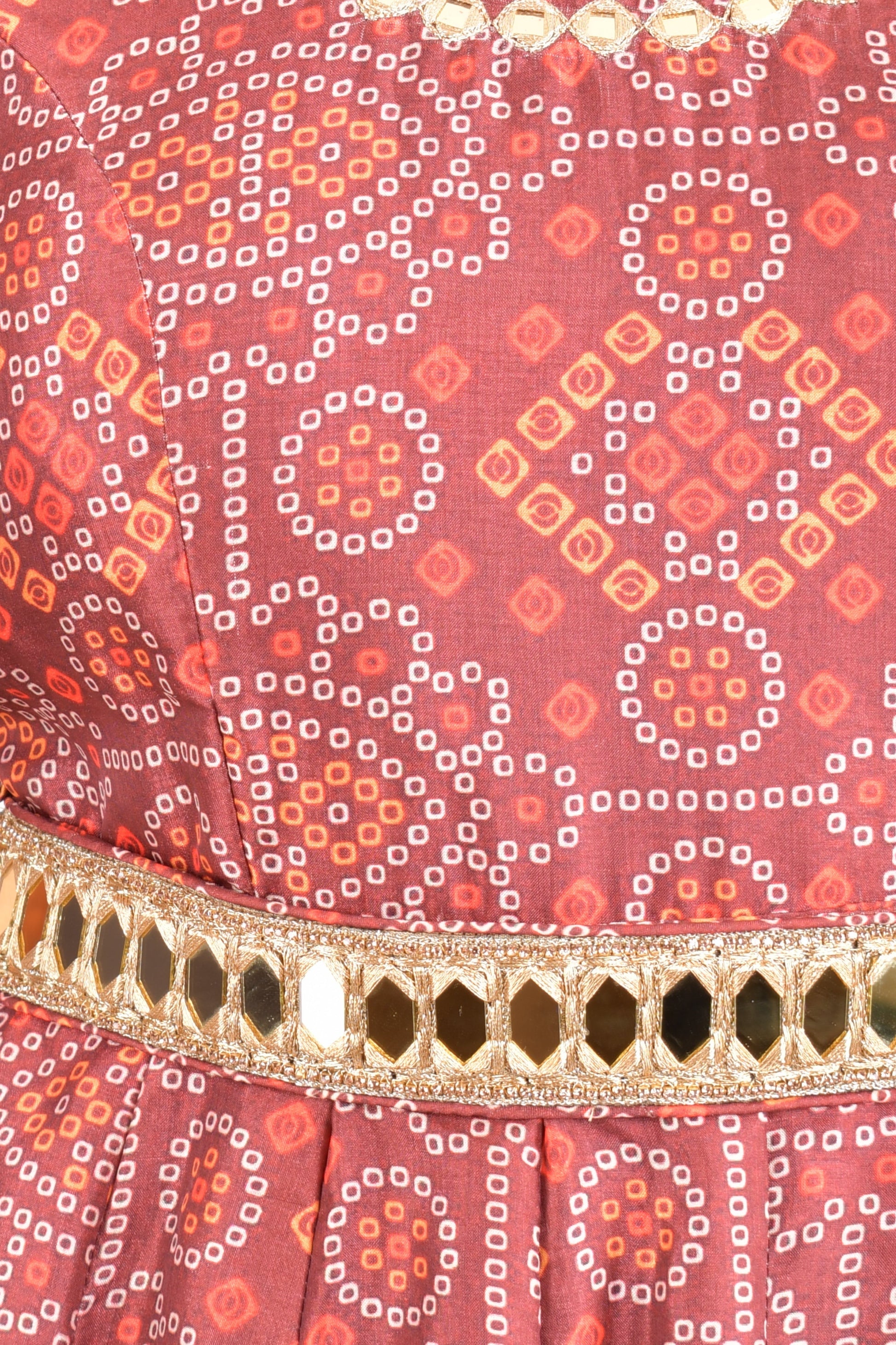 The Darrie Gown features an all-over bandhani print in a rich maroon shade, designed in a polyester-silk blend that drapes beautifully. It comes with a golden mirror belt that adds a refined touch of sparkle.