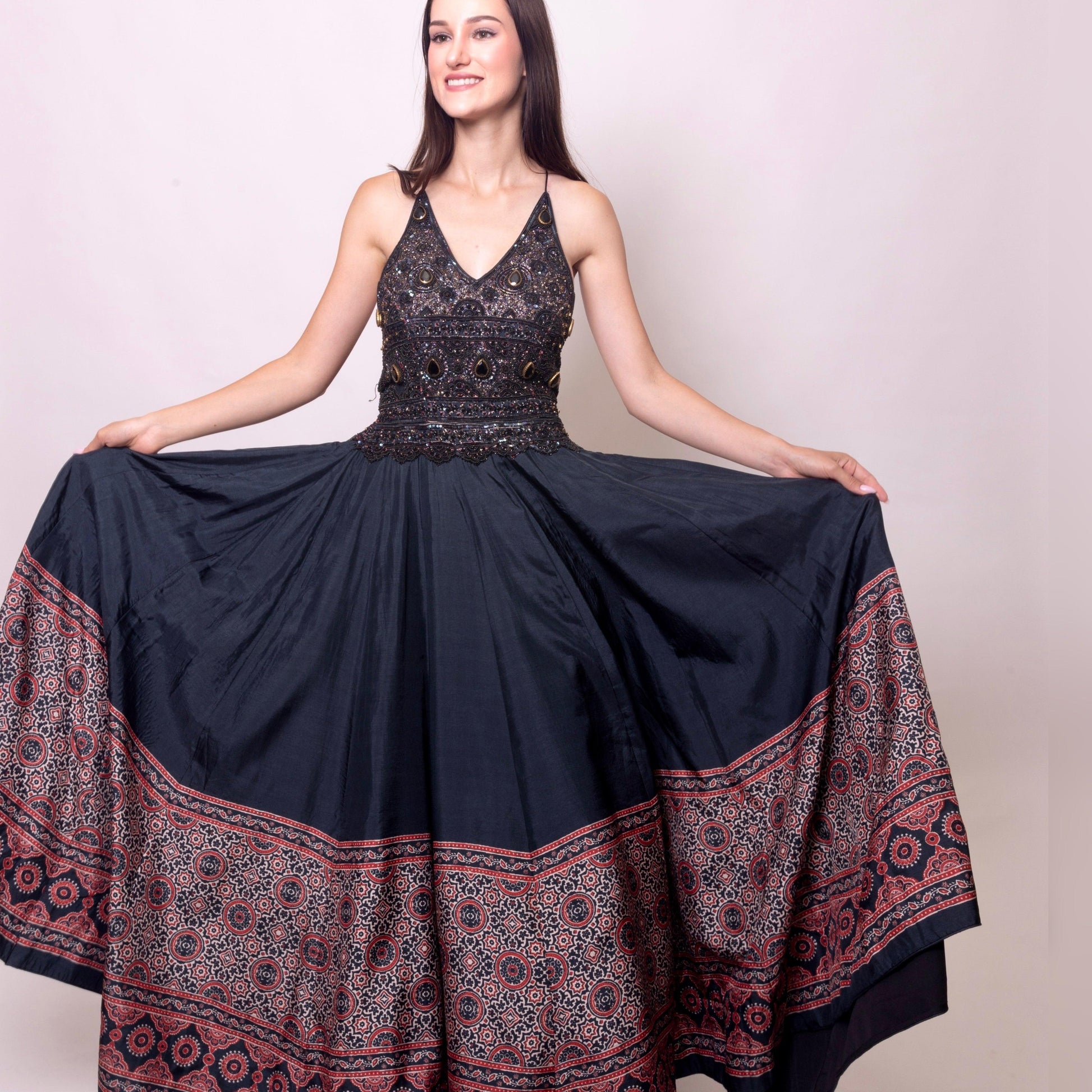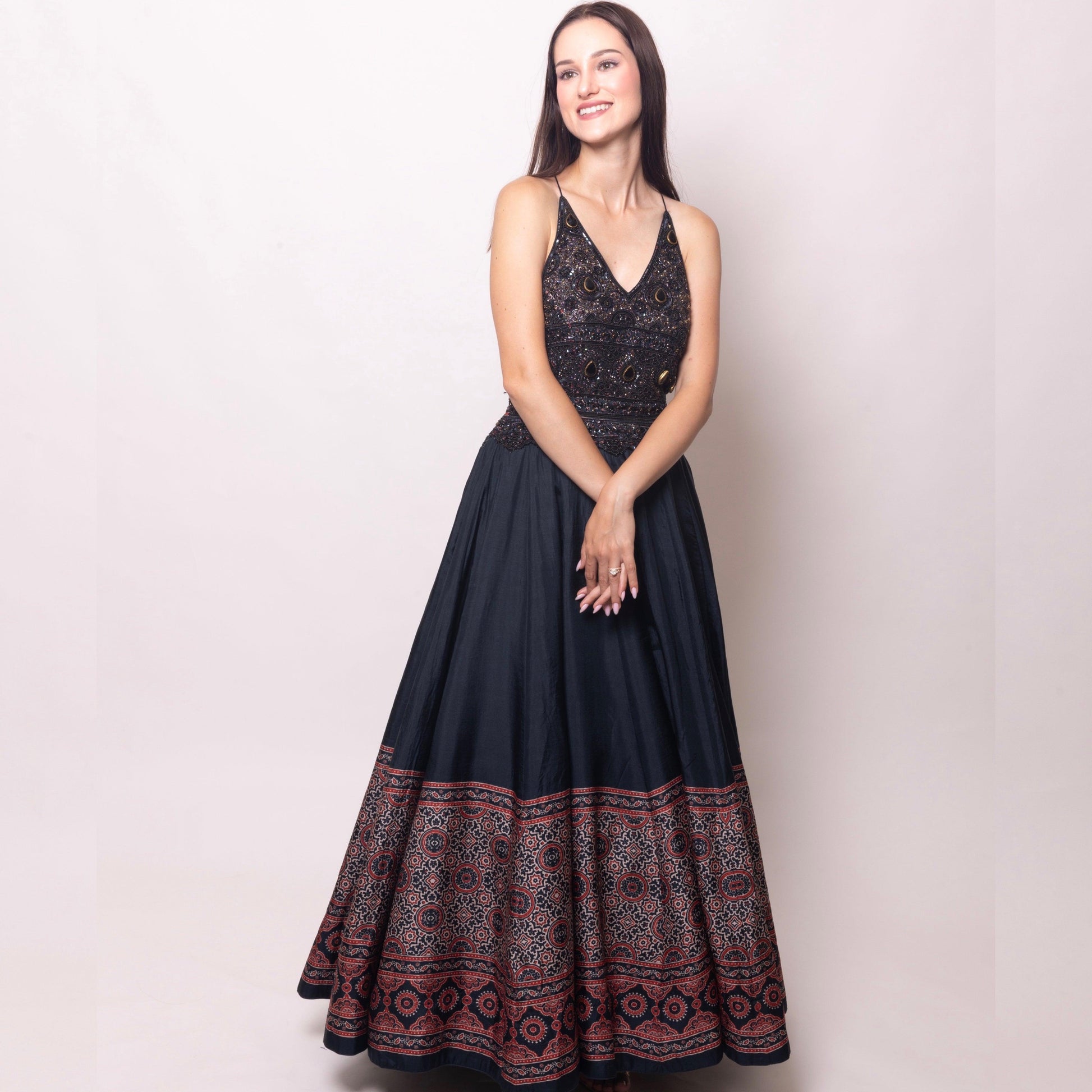 The stunning Elise Black Gown is crafted from premium silk. The torso is adorned with intricate hand-embroidered stone and resham work. The ajrakh print on the skirt introduces a striking contrast effect, blending traditional artistry with contemporary design. A v- neckline adds to its refined and sophisticated charm, making the Elise Black Gown an ideal choice for special occasions or events where you want to stand out while staying classy.