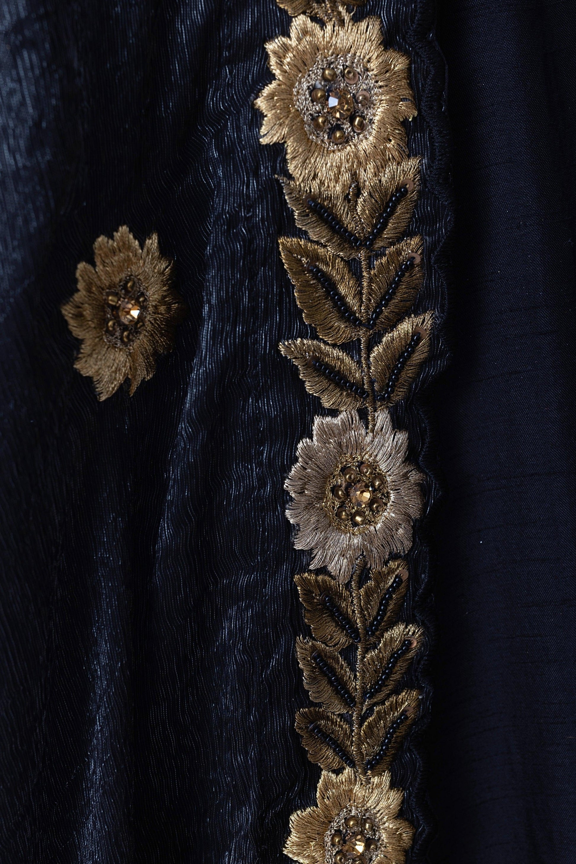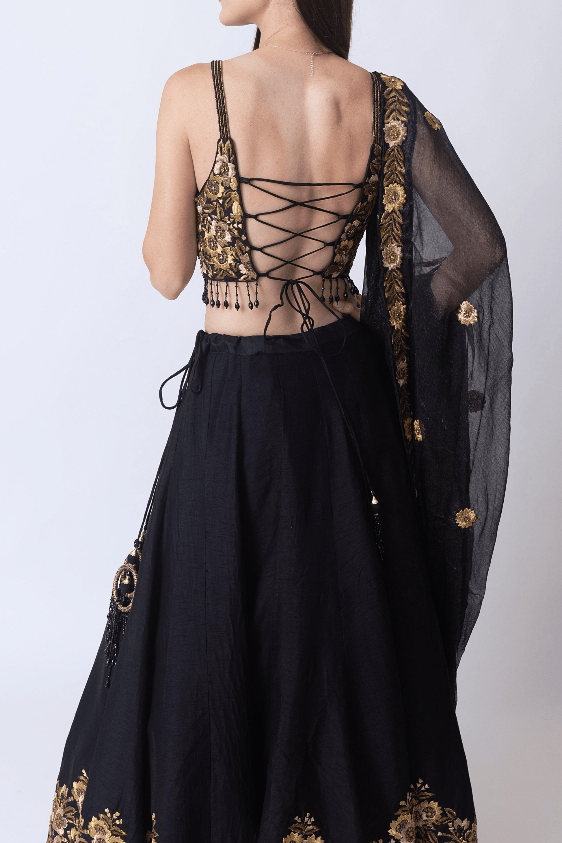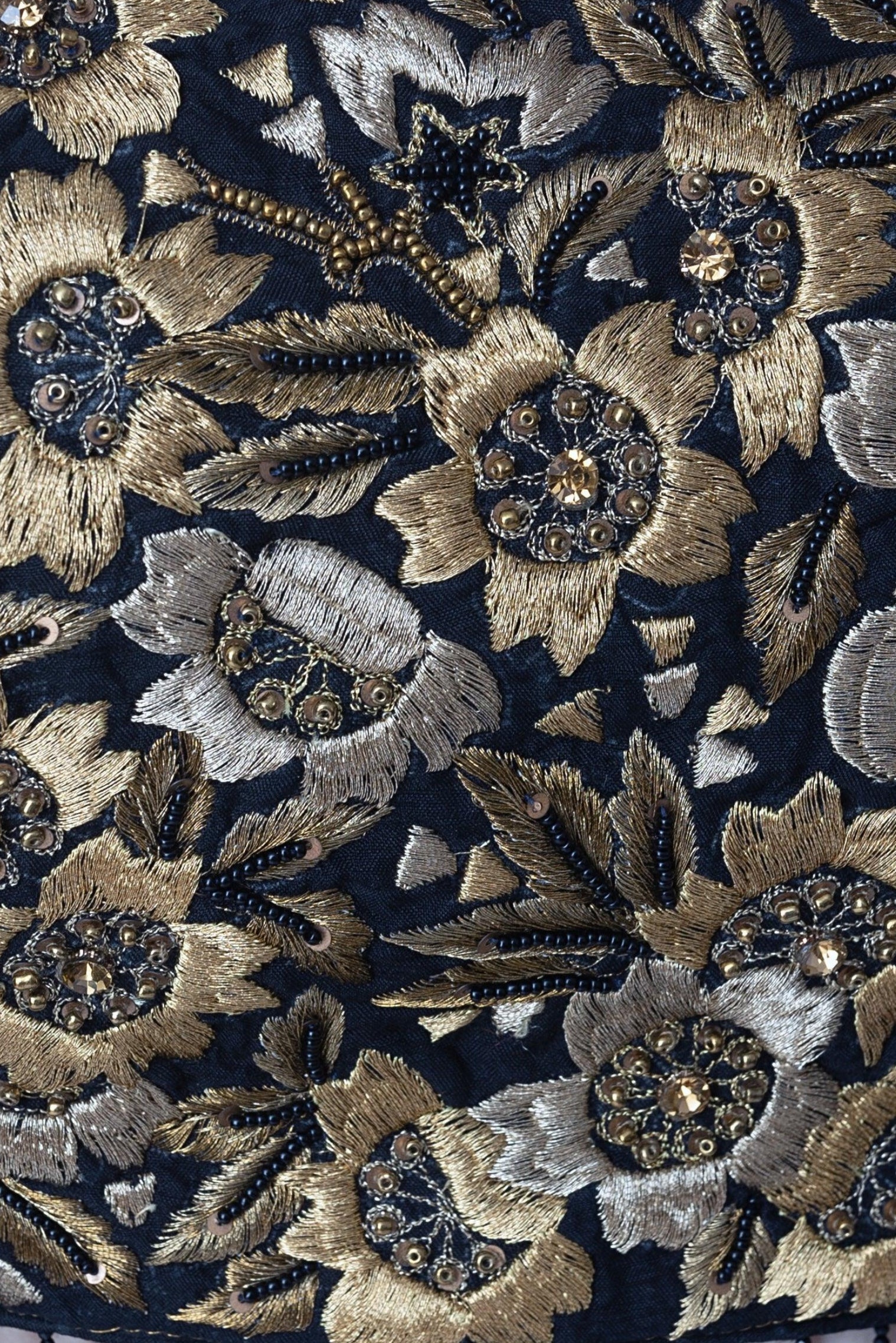 The Black & Gold Raw Silk Lehenga choli from the Glitz & Glam exclusive collection exudes elegance and sophistication. Featuring a hand-embroidered raw silk black lehenga, a heavily embroidered choli, and a black shimmer chiffon embroidered dupatta, this ensemble is designed to turn heads at any event. The striking black and gold combination adds a refined, timeless appeal, making it perfect for weddings, receptions, and formal celebrations. Waer it with matching bag