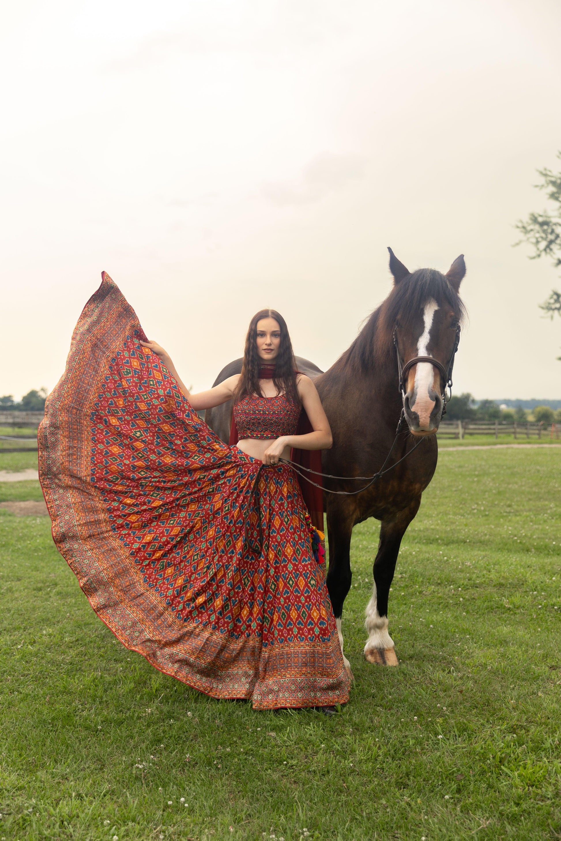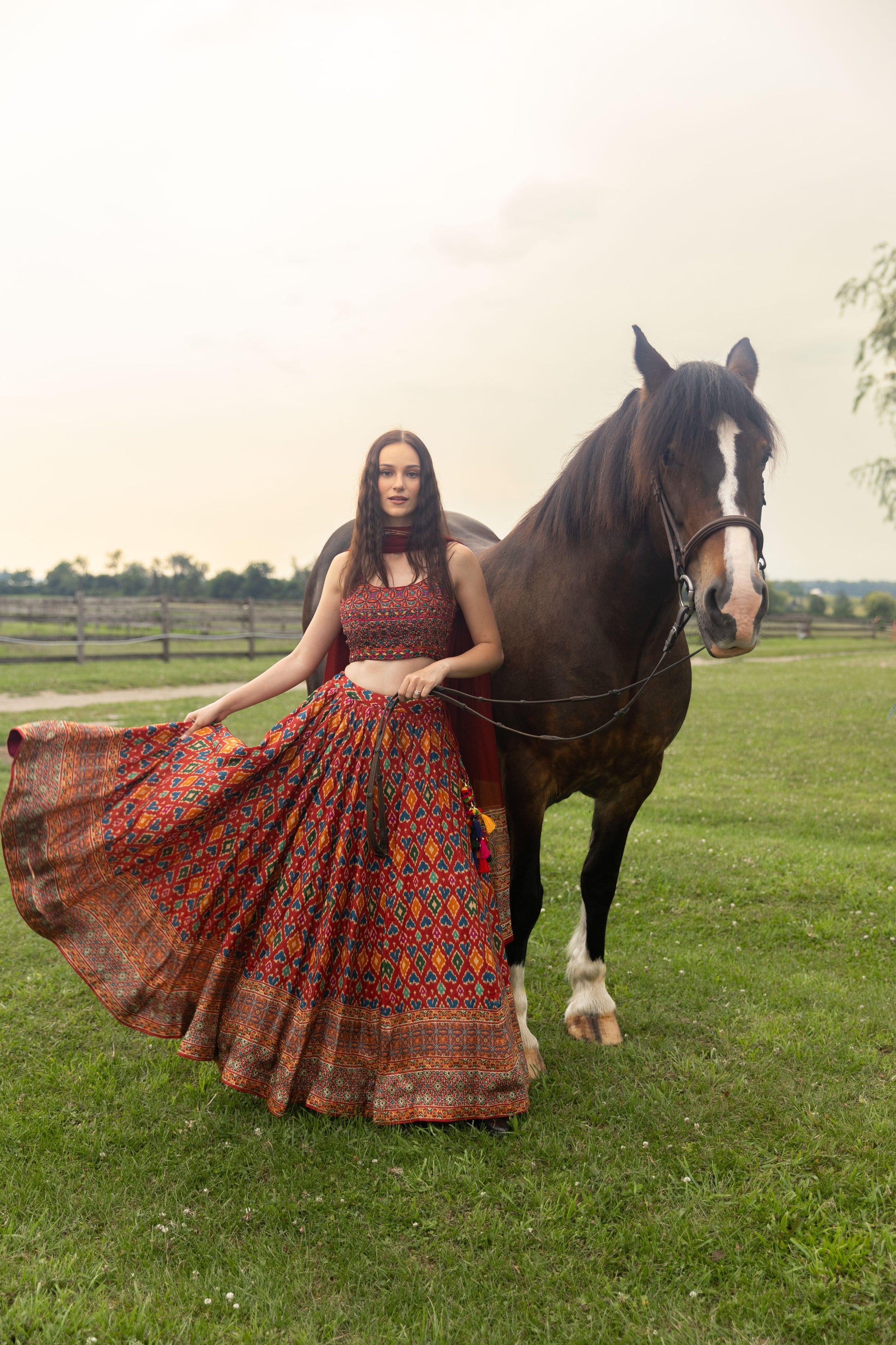 The Louisa Red Patola Print Lehenga Choli Set, part of our Untamed Collection, is a stunning blend of tradition and bold design. The silk lehenga showcases exquisite patola prints in a mesmerizing pattern that draws inspiration from heritage craftsmanship. The heavily embroidered silk blouse, adorned with intricate all-over embroidery and sparkling stone embellishments, adds a touch of opulence to the Louisa Lehenga Choli Set. A georgette dupatta with a border that subtly reflects the lehenga’s patterns completes the look to offer a sophisticated finish. With its beautifully embroidered blouse and eye-catching patola printed lehenga, you're sure to turn heads while staying effortlessly comfortable in this luxurious silk ensemble.