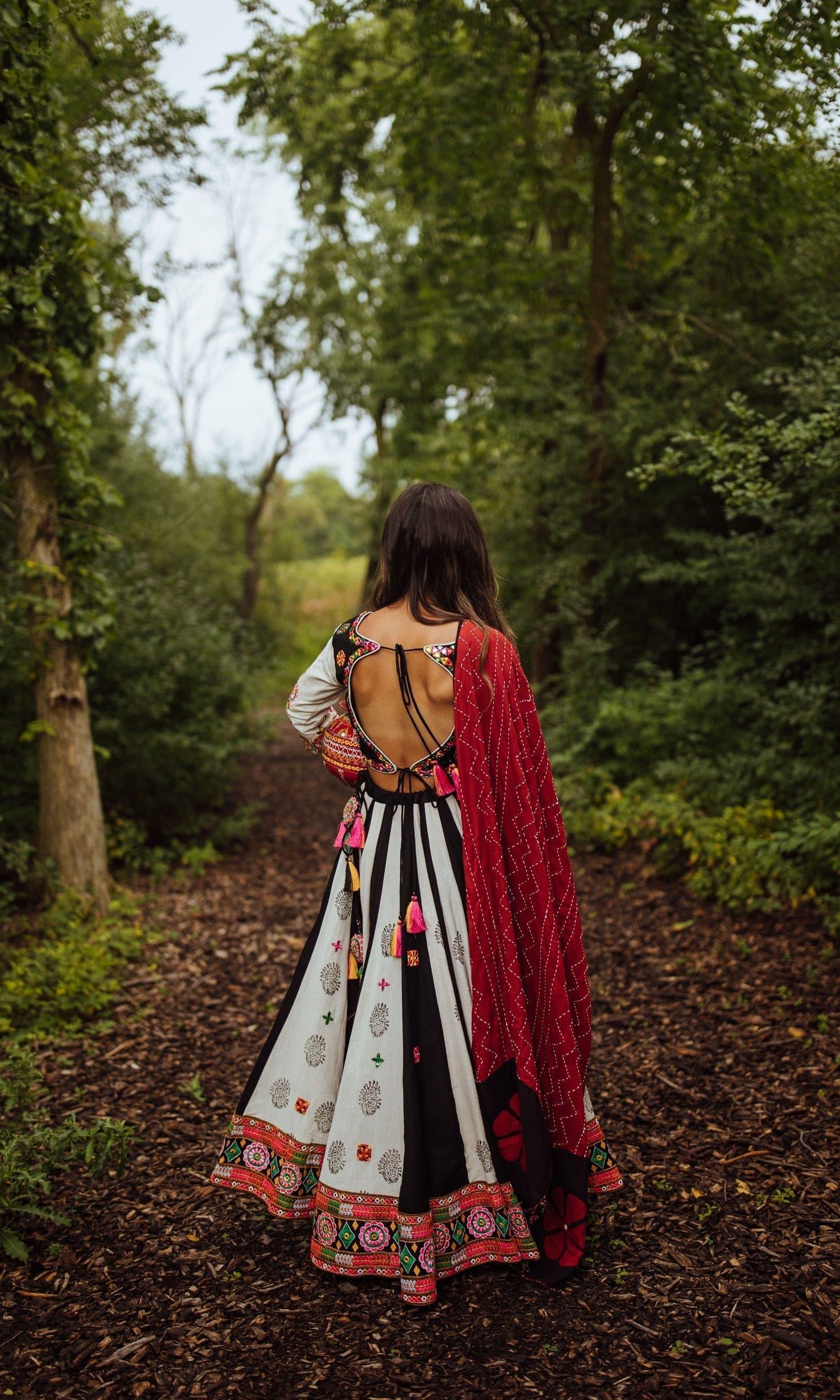 - Chaniya: Approximately 41" in length, embroidered with mirror & resham work, kutchi border, hand-block print