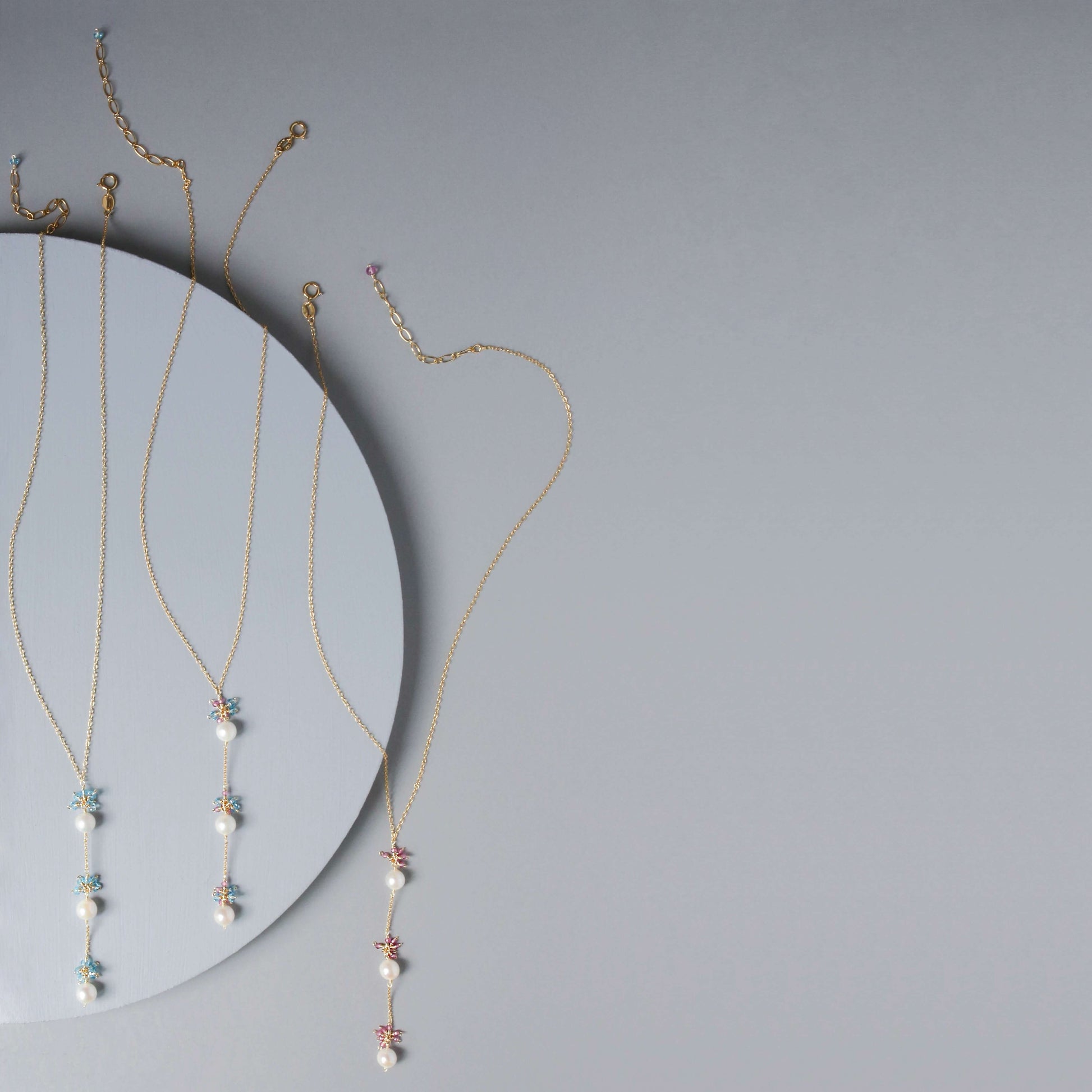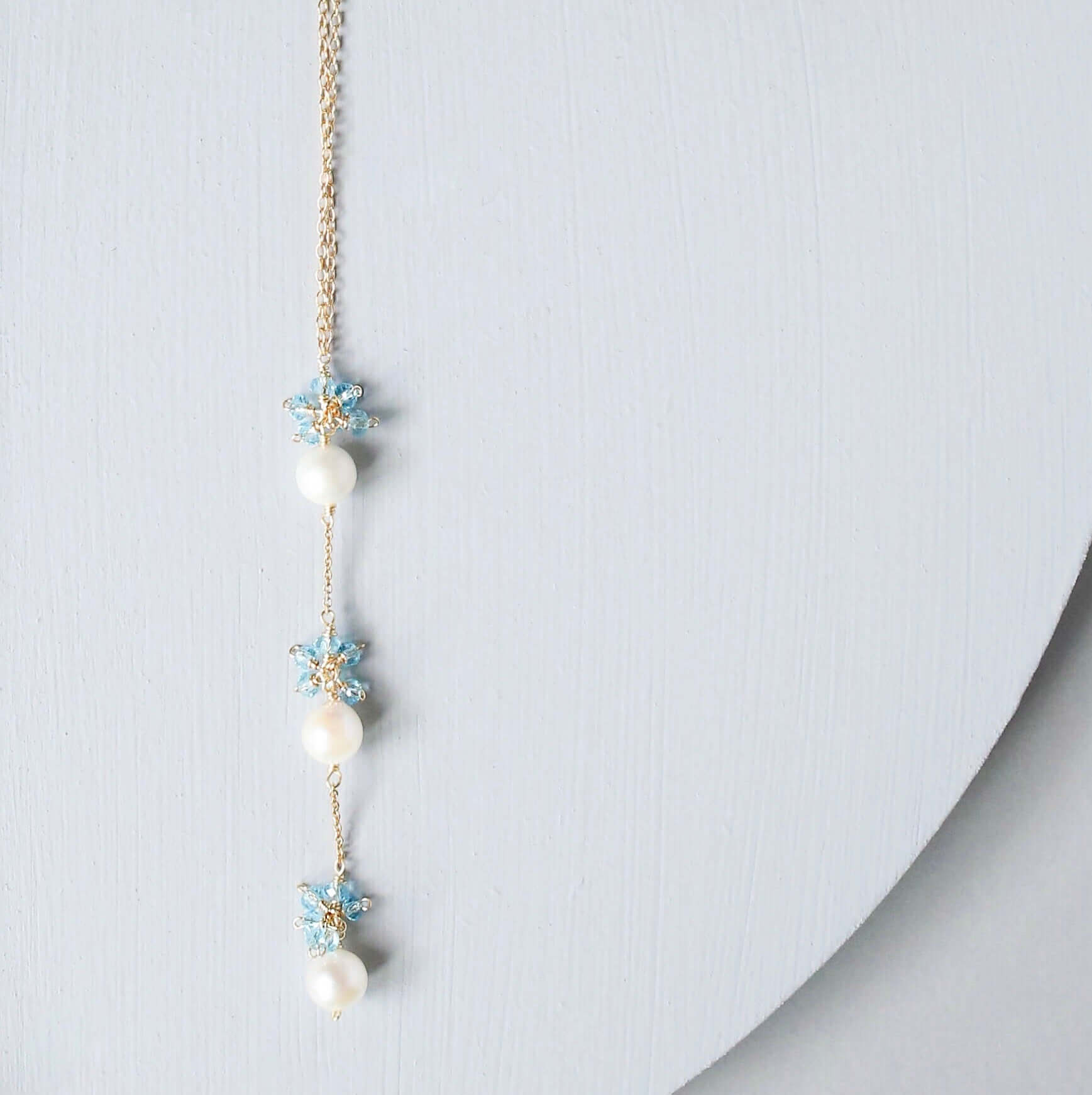 Y design with 3 white freshwater bead pearls paired with genuine aquamarine quartz gemstones.