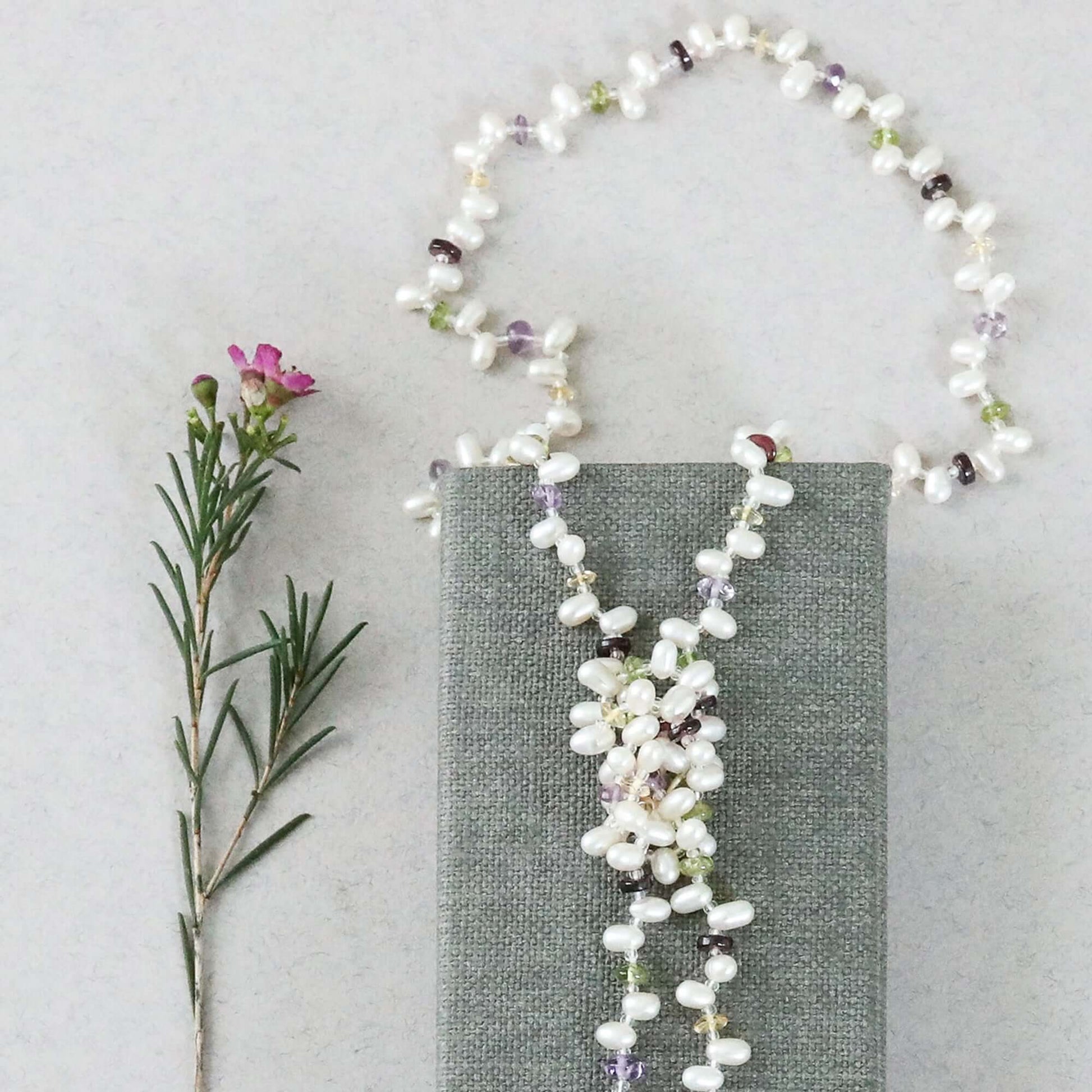 Our version of a modern lariat necklace makes a statement but is easy to wear with anything, including a white t- shirt. Can be tied and wrapped multiple ways. The shape of bead pearls will make it hold whatever shape you choose.