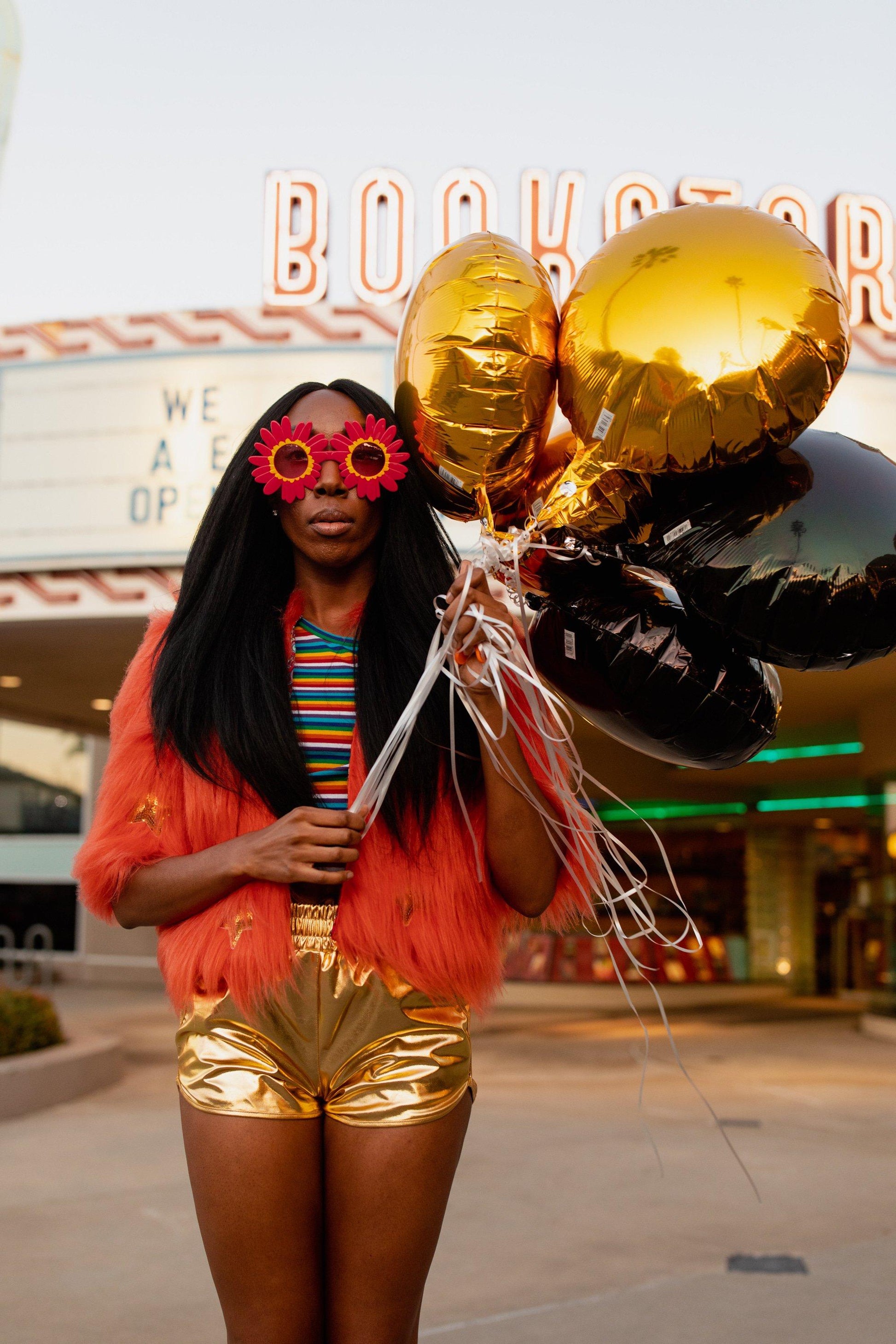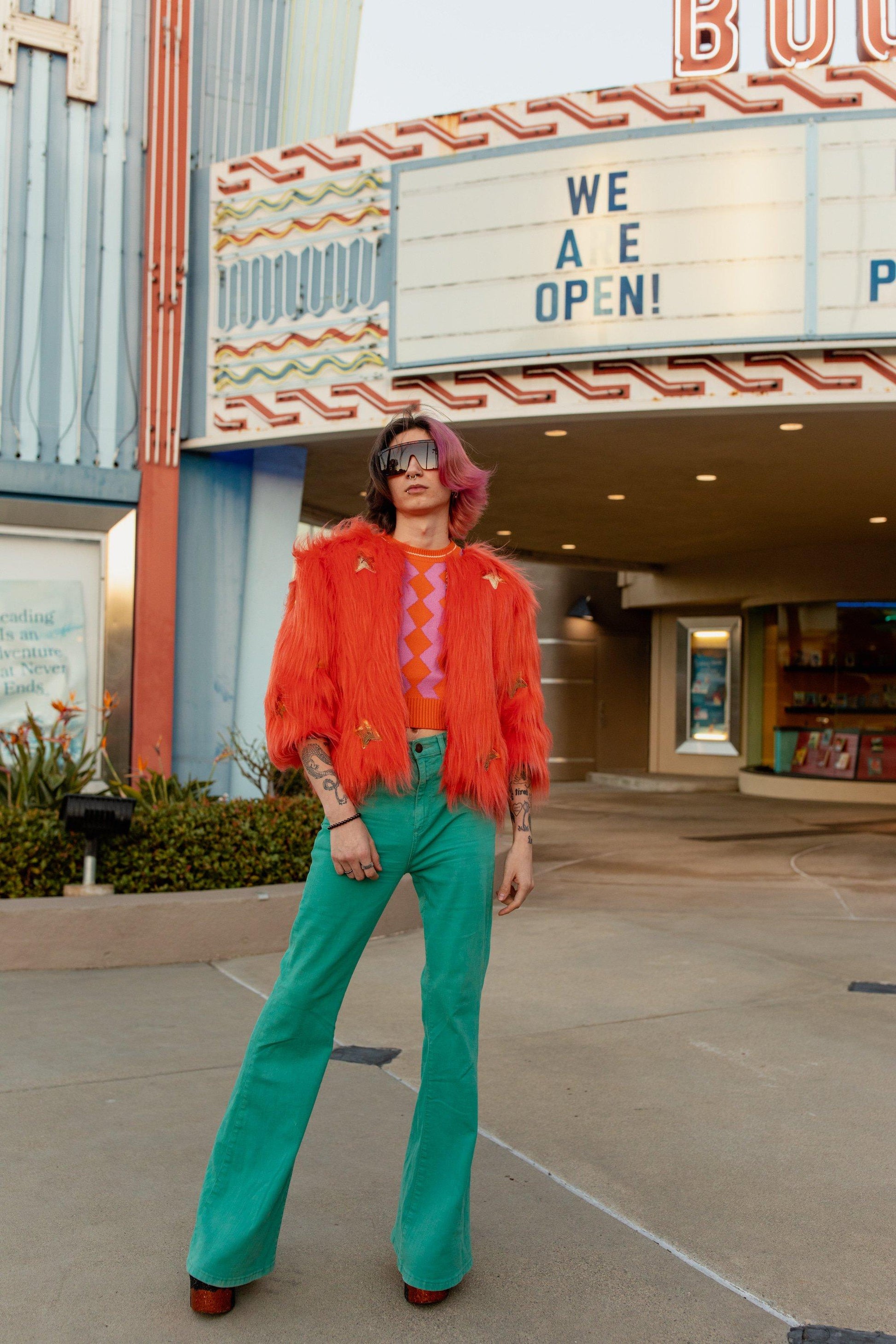 The out-of-this-world Planet Queen jacket is hand crafted with stunning UFO and gold star patches on ultra soft synthetic all faux fur. Featuring pockets and a bright, cheerful rayon lining! Style your look for casual funk, or red-carpet ready.
