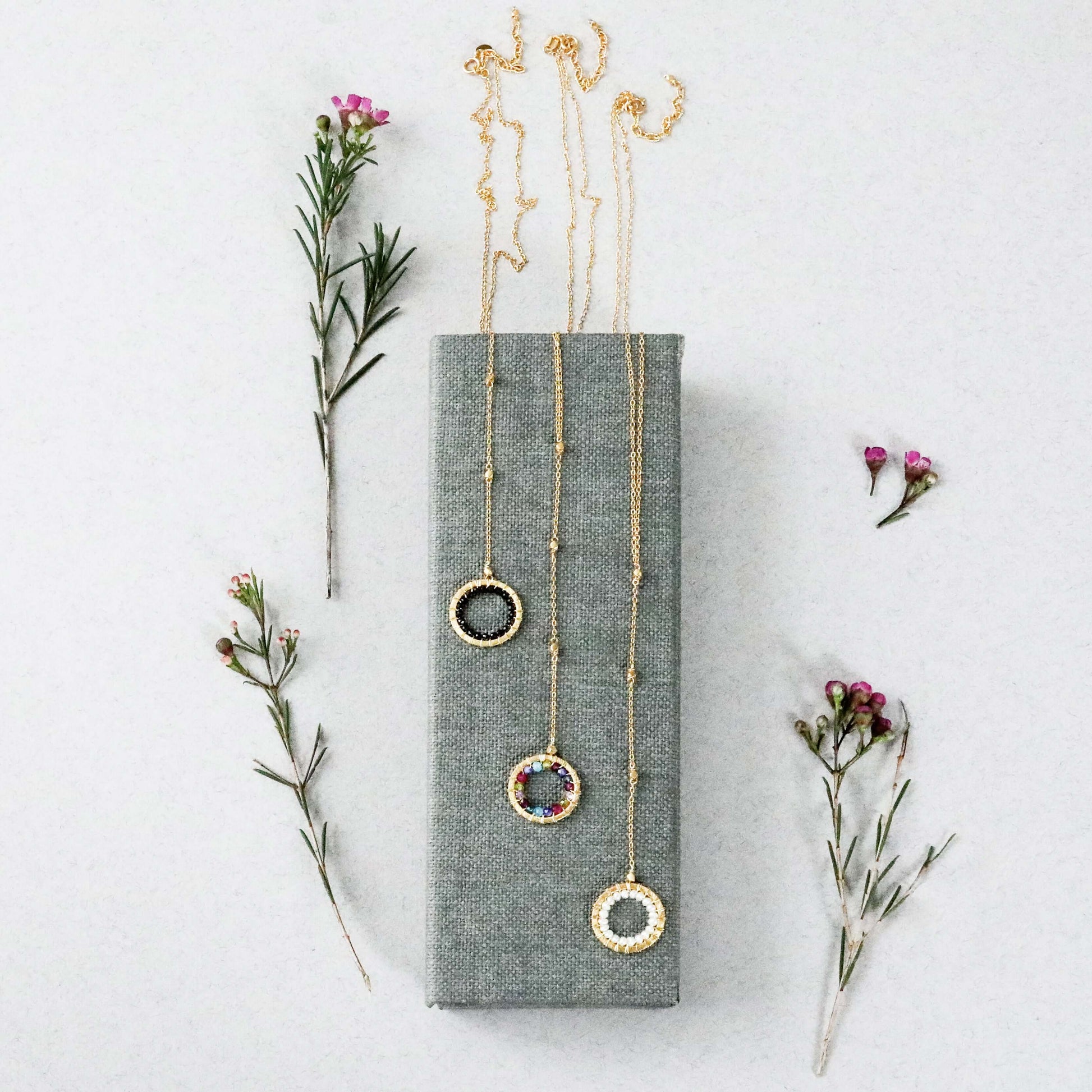 The Halo collection was our very first one. Intended to symbolize the intricate, universal energy woven within us all. This beautiful necklaces is ultra lightweight and perfectly handmade featuring sparkling black spinel gems woven into our unique, mini floating Y pendant design.