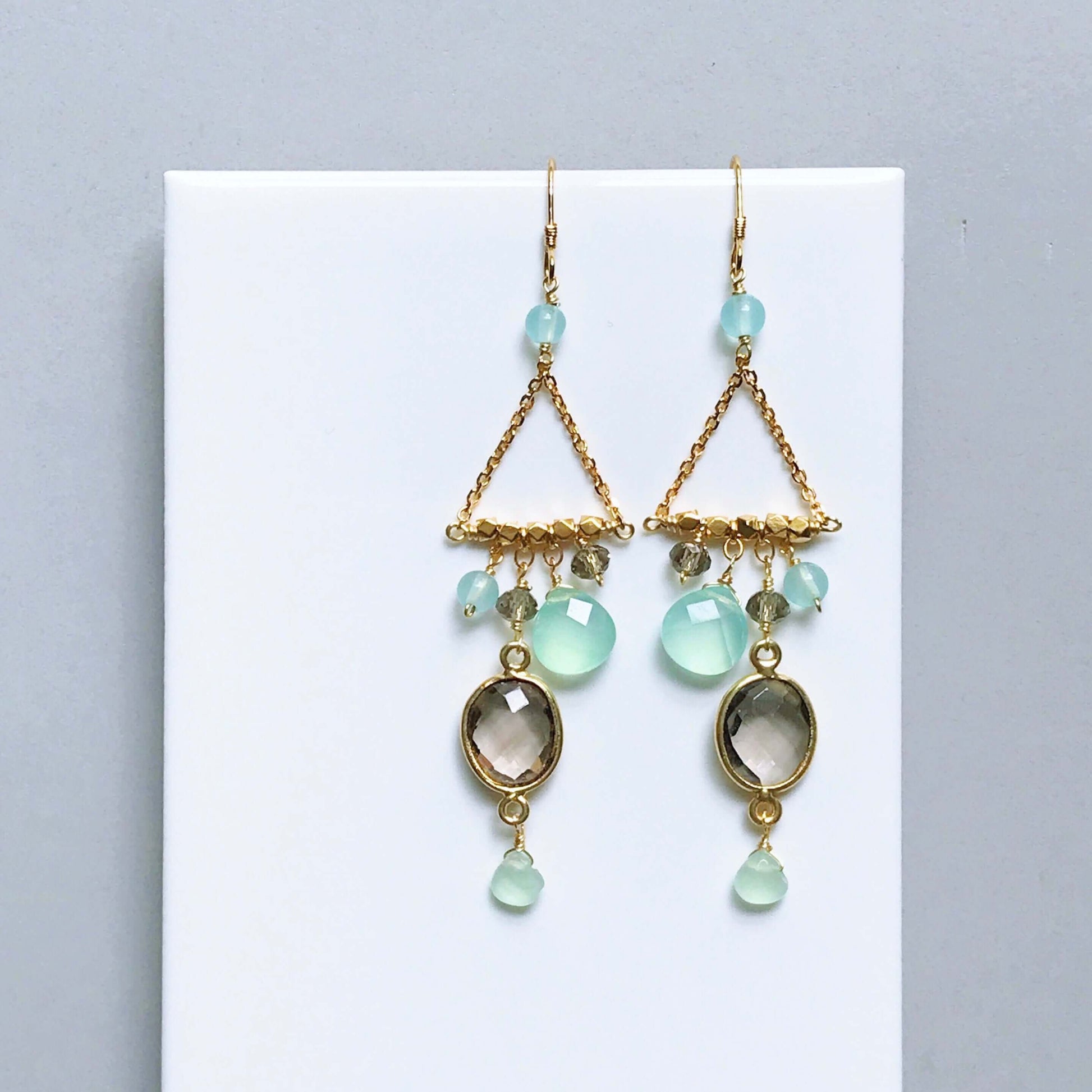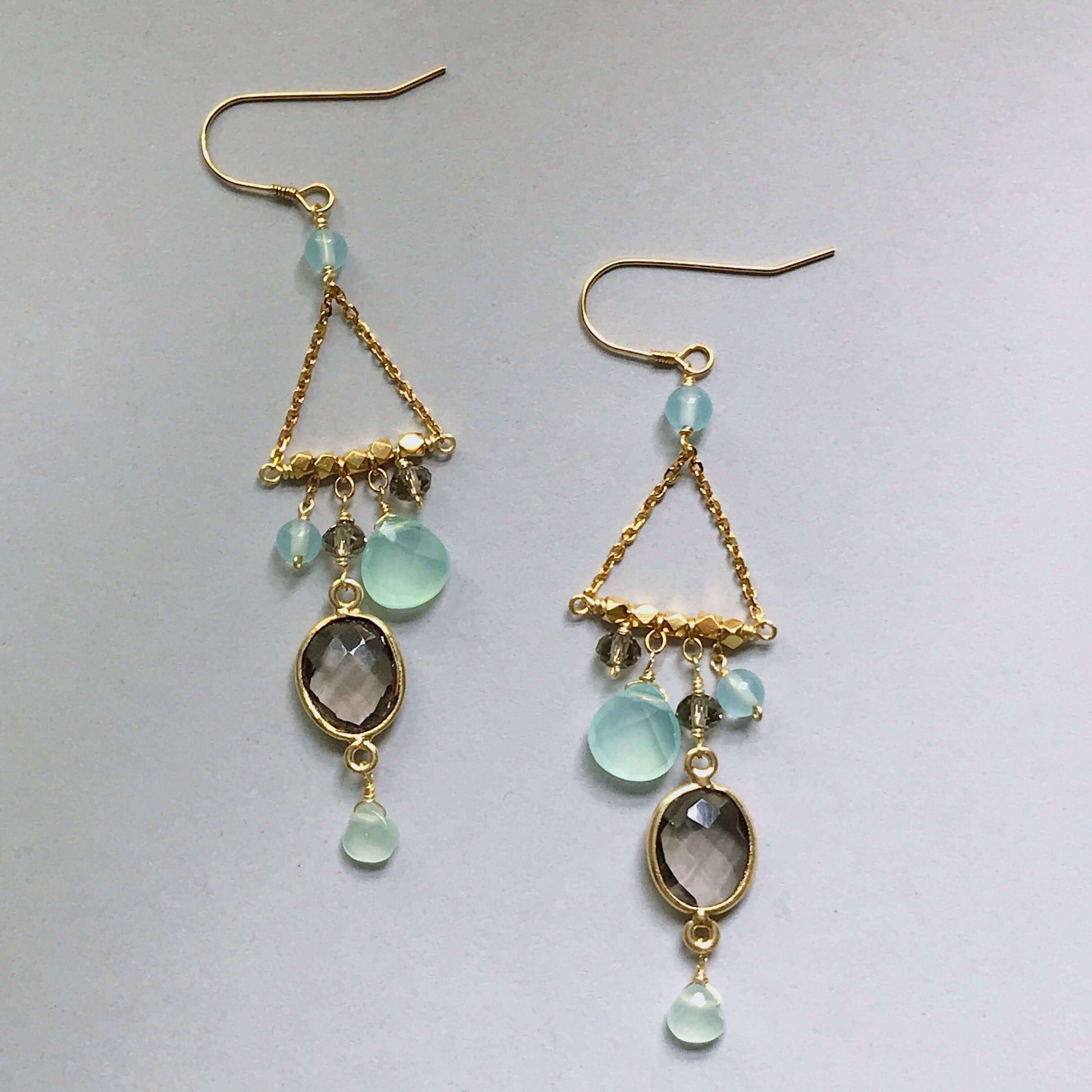 Our "chandie" earrings are a modern take on classic chandelier earrings, using gemstone color combos and varying stone shapes and sizes.