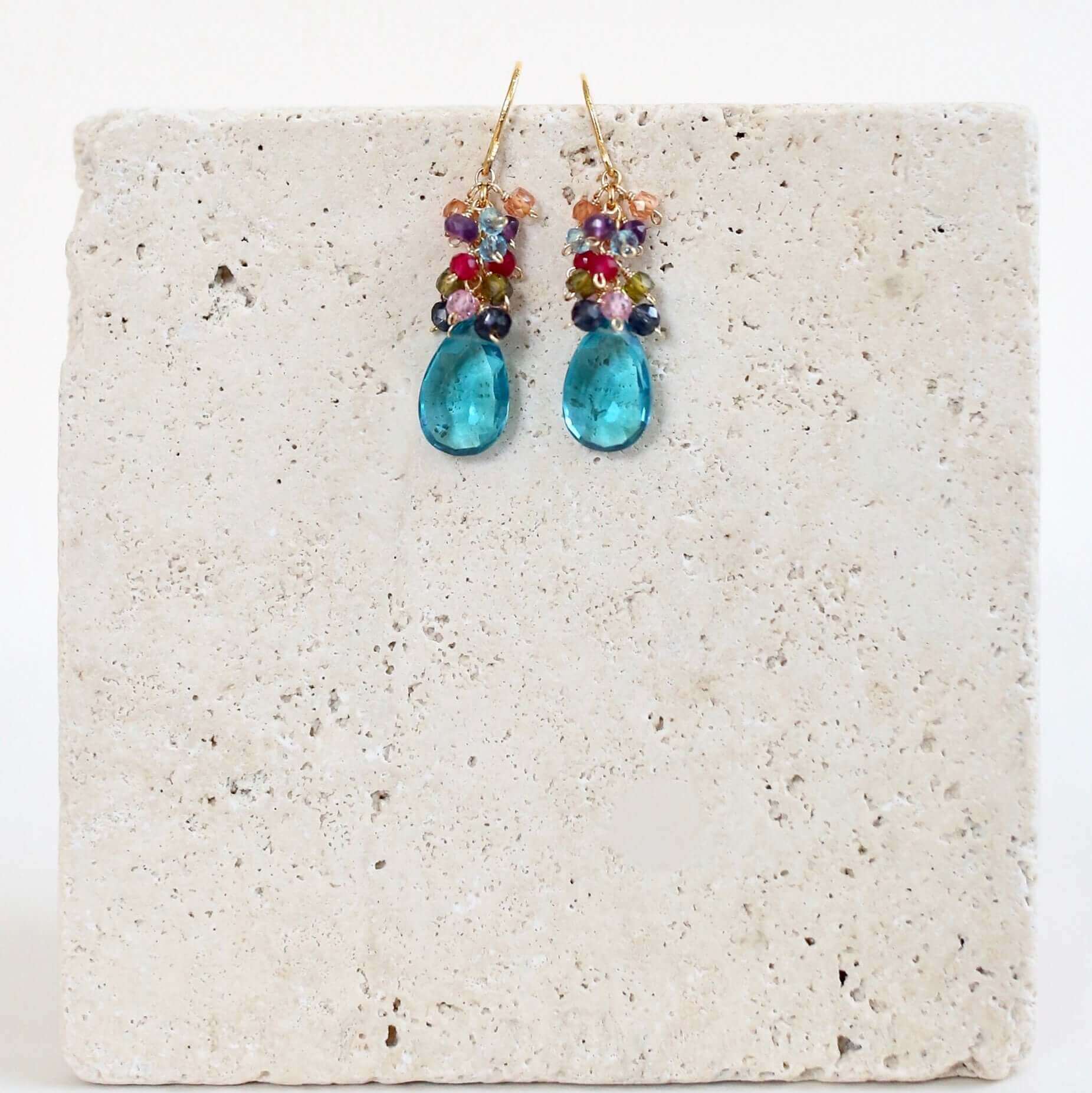 Stunning drops of color. Gold drop earrings made with neon blue quartz topped with a rainbow cluster of gems.