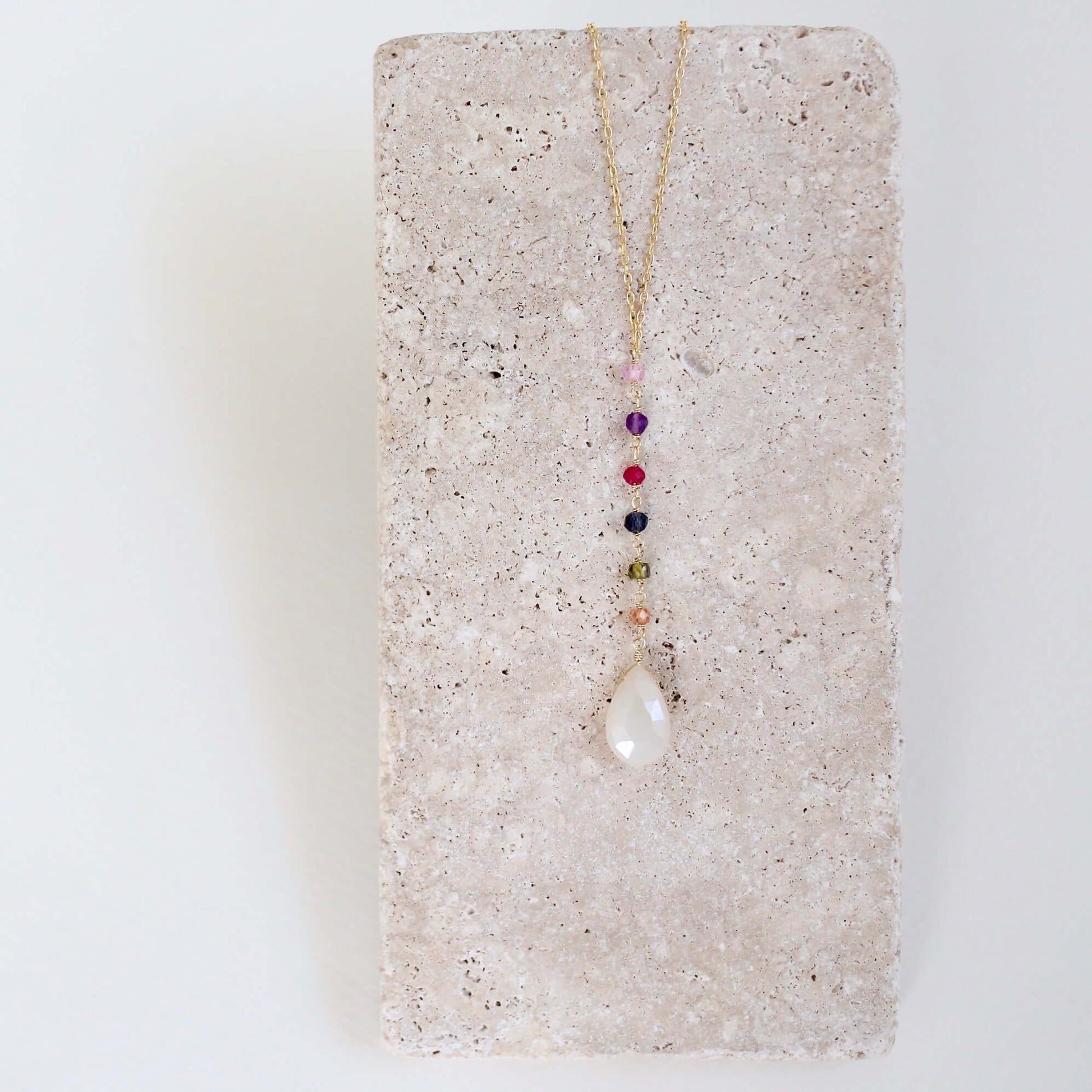 - White Chalcedony gemstones paired with multi color accent stones- 18-20" long with a 2" extender chain